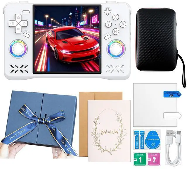 This ideal gift set includes 1x HatiLuminis game console, 1x organizer bag, 1x TYPE-C charging cable, 1x 128GB TF card, 1x screen film, and 1x manual, suitable for family, friends, game lovers, and nostalgia players.