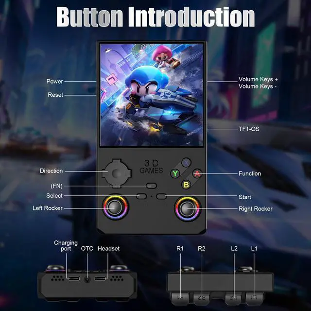 V40 MAX New SystemThis is a high-performance retro handheld game console equipped with a 1.5GHz 64-bit processor RK3326 CPU, Mali-G31MP quad core GPU, 4GB * 2 RAM DDR3L, which can easily run large 2D and 3D games. The new operating system provides a more sensitive, latency free, and smoother experience.