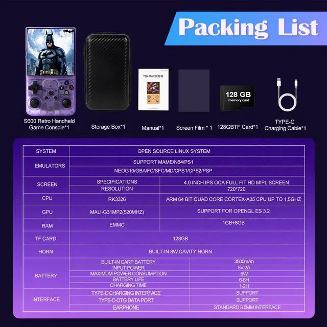 S600 Retro Handheld Game ConsoleBlast into nostalgia with the S600 retro snap game console. This S600 handheld game console equipped with RK3326 64-bit quad-core processor, it can run 2D/3D games smoothly, for endless fun. It also comes with a large 128GB TF card for the vast game libraryno internet required