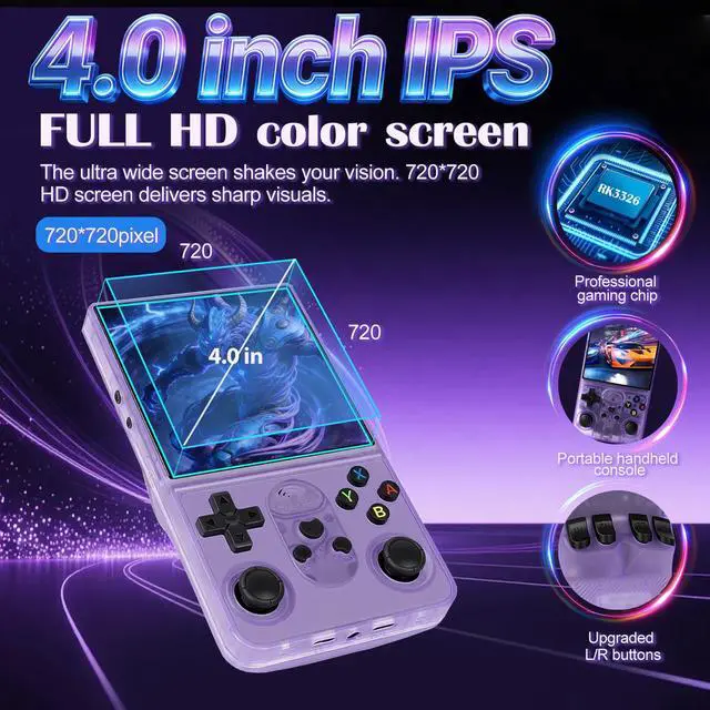 4.0 Inch HD IPS DisplayThe S600 handheld emulator showcases a brilliant 4.0 inch IPS display that delivers fantastic visuals with a resolution of 720x720 pixels, ensuring that both intricate game graphics and dramatic effects are represented with clarity, allowing players to enjoy a more immersive gaming experience