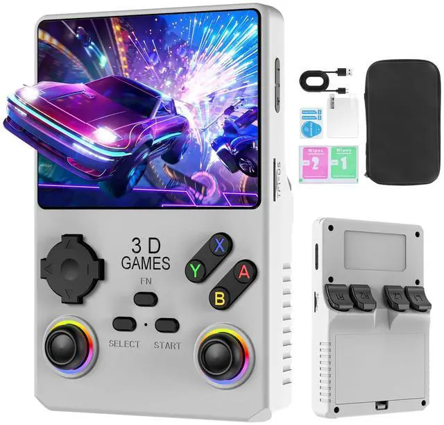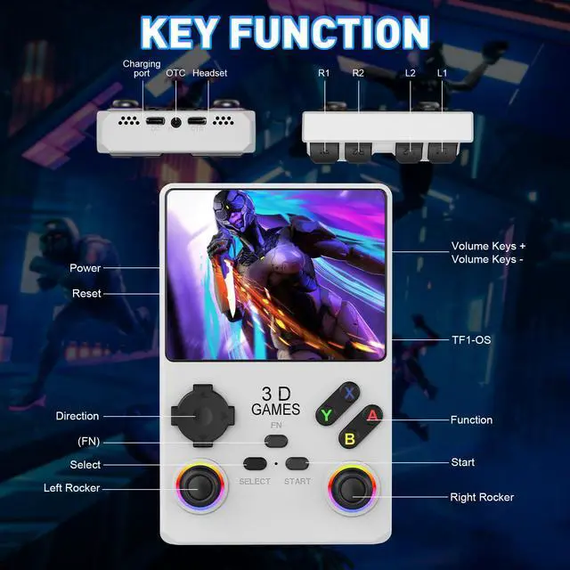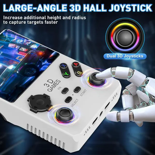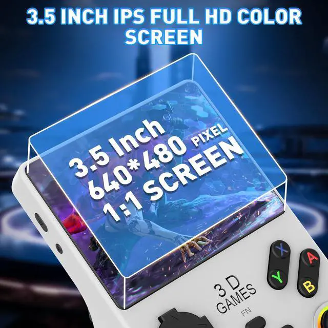 3.5-inch IPS high-definition screenThe 3.5-inch IPS high-definition full screen ensures error free viewing at different angles, with a resolution of 640 x 480 and clearer RGB colors. The screen is made of upgraded tempered glass, providing sturdy protection and ensuring durability and shatter resistance. Dual 3D joysticks and cool neon lights provide you with a better gaming experience.