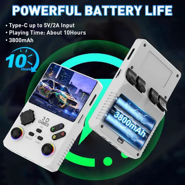 V40 PRO New SystemThis is a high-performance retro handheld game console equipped with a 1.5GHz 64-bit processor RK3326 CPU, Mali-G31MP quad core GPU, 4GB * 2 RAM DDR3L, which can easily run large 2D and 3D games. The new operating system provides a more sensitive, latency free, and smoother experience.