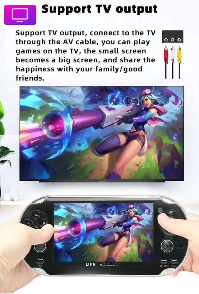 The game console can be connected to the TV through an AV cable, one end is plugged into the game console, and the other three connectors are inserted into the TV according to the colors, and select the corresponding signal source on the TV, then select on the game console screen and press the A key to enter "Setting" ---"TV-OUT", select "PAL" or "NTSC" (according to the TV system of the user's country).