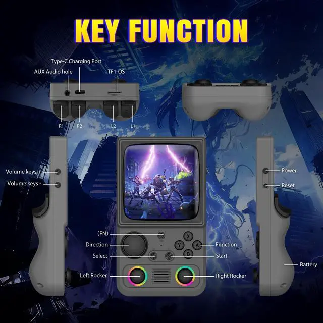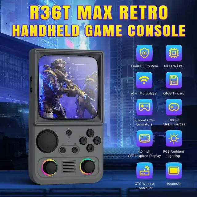 Precision Controls with Customizable RGB Lighting Designed for accuracy and comfort, the R36TMAX handheld game console includes a high-precision joystick for responsive gameplay. The hand held game console also features 16 million-color RGB lighting around the joystick with 16 adjustable modes, allowing you to personalize your setup or turn the lights off for a minimalist look.