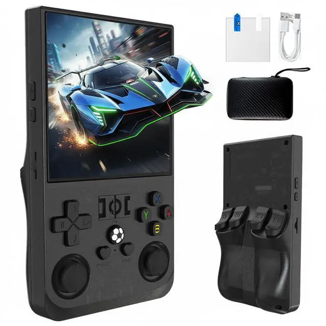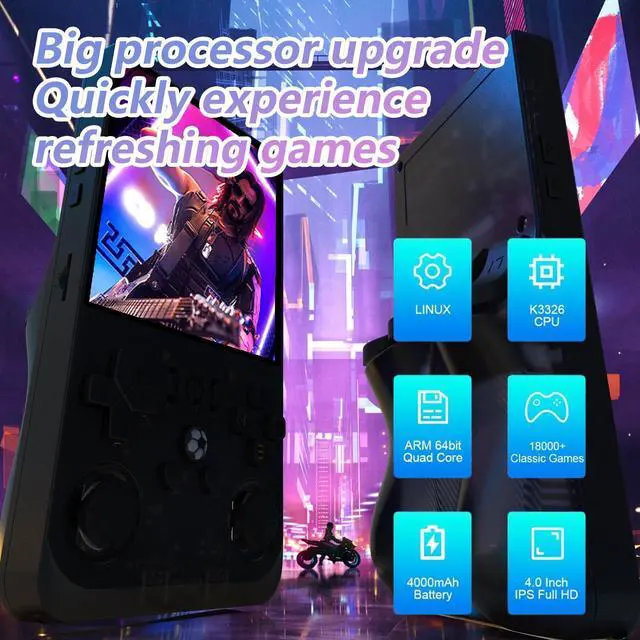 R36MAX Retro Handheld Game ConsoleThis retro handheld game console runs on a Linux system with a 1.5GHz 64-bit RK3326 CPU and ARM64-bit quad-core Cortex-A35 processor, delivering smooth performance for 2D and 3D games. Whether you're using it as an arcade emulator or a handheld emulator, it ensures uninterrupted gameplay for all your favorite classics.