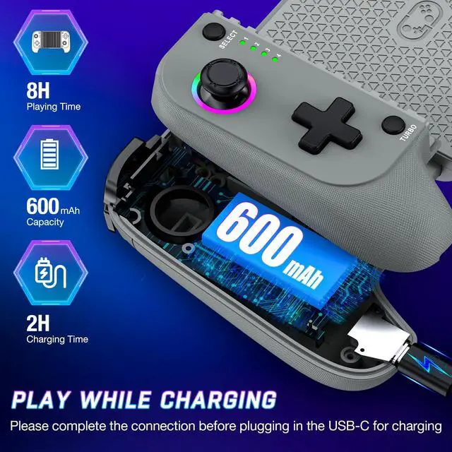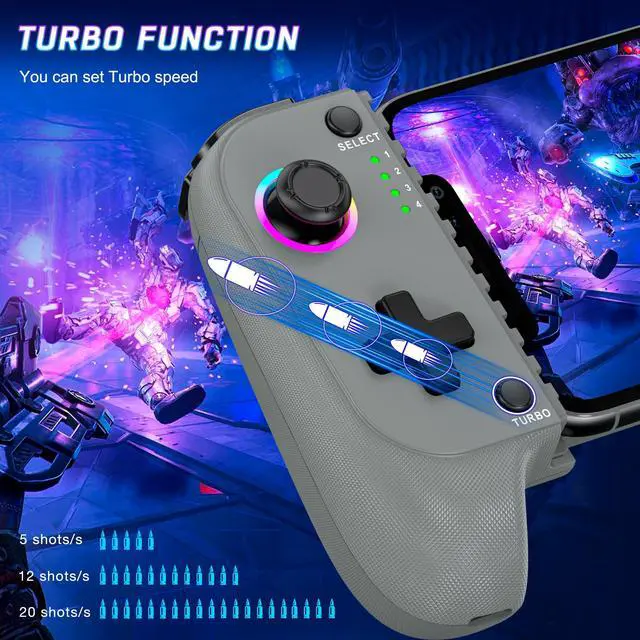 360°Hall Joystick & 3 Speeds Adjustable TURBO Function Our wireless controller for iphone is equipped with upgraded hall effect joystick that no drift, no wear out, no dead zones. During the game,more responsive, any small movements will be accurately reflected, greatly improving the gaming experience for loyal players. The Turbo function supports manual and automatic continuous firing, with three adjustable speeds: 5/12/20 per second