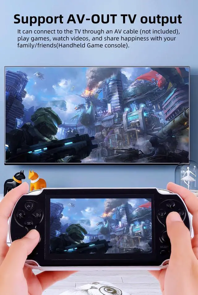The game console can be connected to the TV through an AV cable, one end is plugged into the game console, and the other three connectors are inserted into the TV according to the colors, and select the corresponding signal source on the TV, then select on the game console screen and press the A key to enter "Setting" ---"TV-OUT", select "PAL" or "NTSC" (according to the TV system of the user's country).