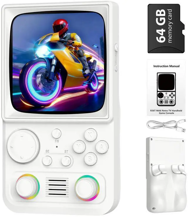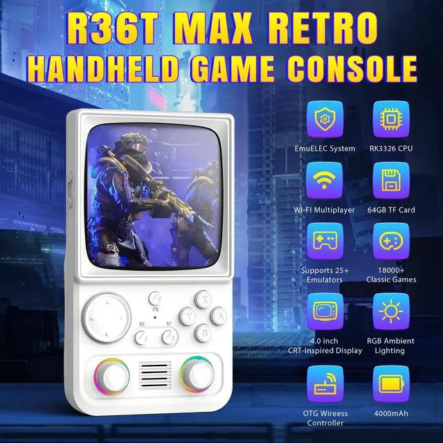 All-in-One Retro Gaming Console Handheld The R36TMAX is a powerful retro gaming console that supports over 23 classic emulators. As a preloaded game console, it comes with a 64GB memory card packed with timeless titles, delivering hours of nostalgic gameplay right out of the box. Perfect for anyone seeking a complete retro video game console experience.