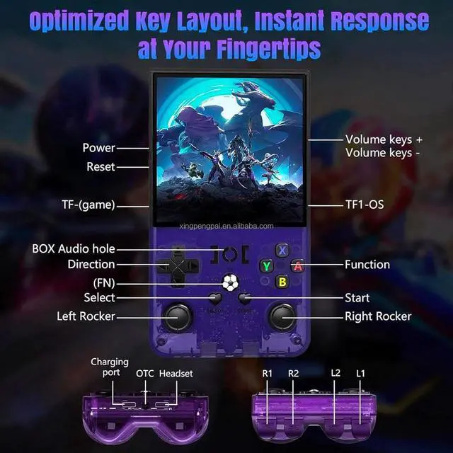Linux operating system with strong hardware: thanks to the Linux system and RK3326 quad-core CPU (1.5 GHz, 64-bit), the console runs stable and reliable. Two joysticks, full buttons, speaker and headphone jack ensure a comfortable gaming experience.