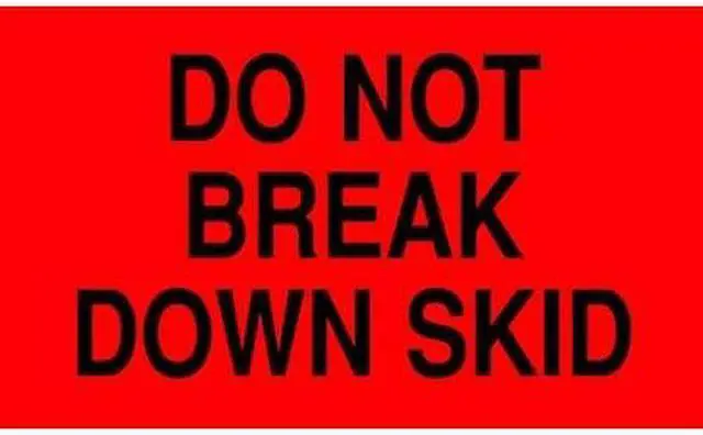 Instructional Handling Label, Language English, Primary Label Subject Care Instruction, Message Header Do Not, Message Do Not Break Down Skid, Label Width 5 in, Label Height 3 in, Material Adhesive Back, Paper, Background Color Red, Labels per Roll 500, Package Quantity 500. This item has been restricted from sale in the following state (s): []