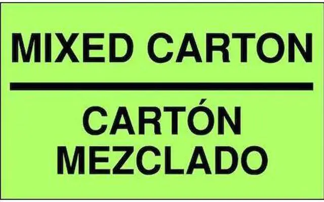 Instructional Handling Label, Language Spanish, Primary Label Subject Receiving, Message Header Inspection, Message Mixed Carton/Carton Mezclado, Label Width 5 in, Label Height 3 in, Material Adhesive Back, Paper, Background Color Green, Labels per Roll 500, Package Quantity 500. This item has been restricted from sale in the following state (s): []