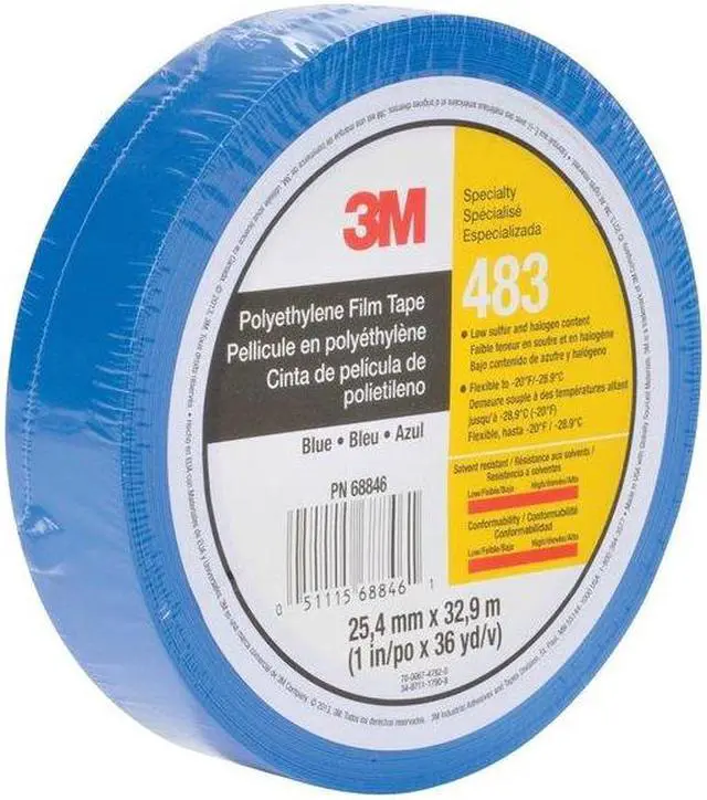 Film Tape, Tape Color Blue, Tape Brand 3M (TM), Brand and Series 3M 483, Imperial Tape Length 36 yd, Imperial Tape Width 1 in, Imperial Tape WxL 1 in x 36 yd, Tape Thickness 5.3 mil, Tape Backing Material Polyethylene Film, Tape Adhesive Material Rubber, Maximum Tape Performance Temperature 170 Degrees F, Minimum Tape Performance Temperature -20 Degrees F, Temperature Range -20 Degrees to 170 Degrees F, Series 483, Tape Type Sealing Tape, Tape Sub-Type Water-Tight Sealing Film Tape. This item has been restricted from sale in the following state (s): []