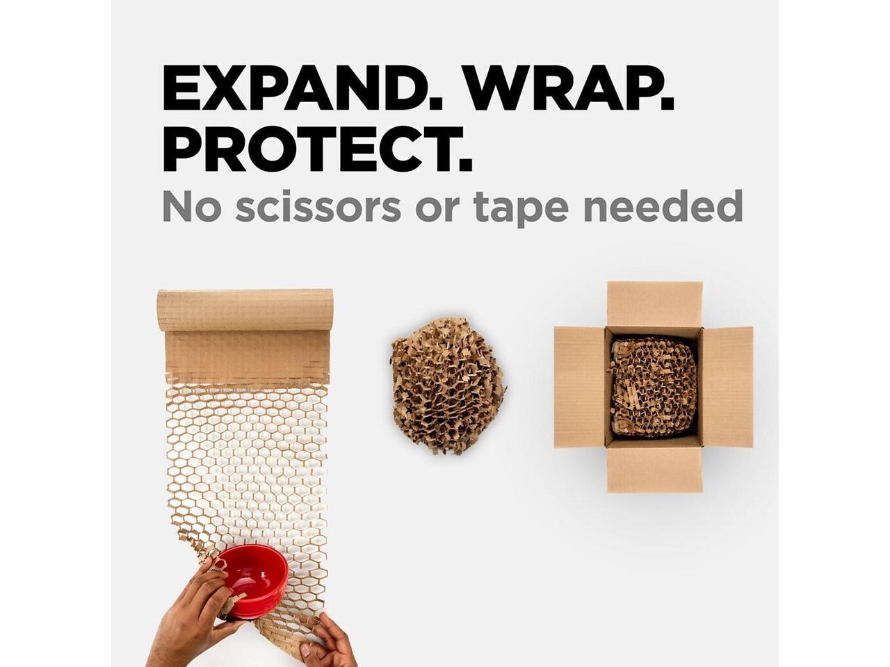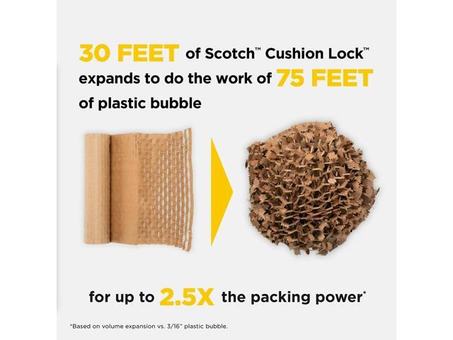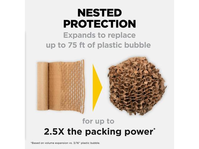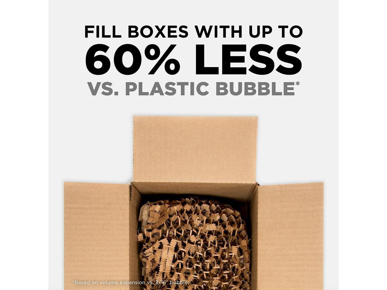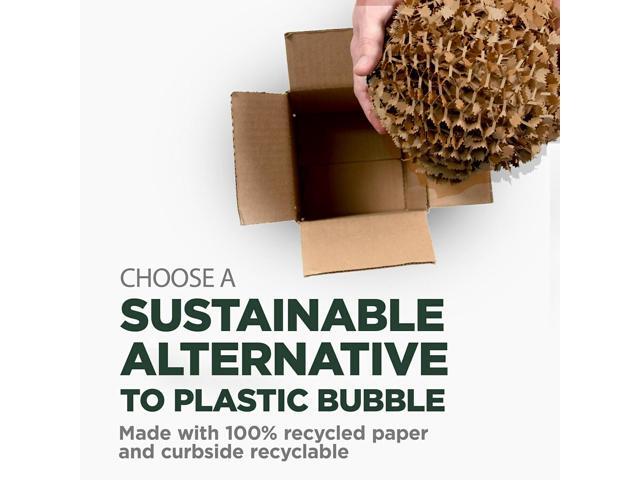 - USE IN PLACE OF PLASTIC BUBBLE - Expands to fill a box using up to 60% less vs. plastic bubble (* to fill a cubic foot box vs. standard 3/16" plastic bubble) . A SUSTAINABLE ALTERNATIVE - Made with 100% recycled paper and 100% curbside recyclable after-use. EXPAND THE WAY YOU PACK: Great for shipping, moving and storage. HOW TO USE The 1,000-ft Roll: When anchored by the dispenser, you can pull the roll vertically towards you with both hands, then simply wrap in 360° fashion to cover your item (4-5 wraps recommended). Tear by hand then place into your box.