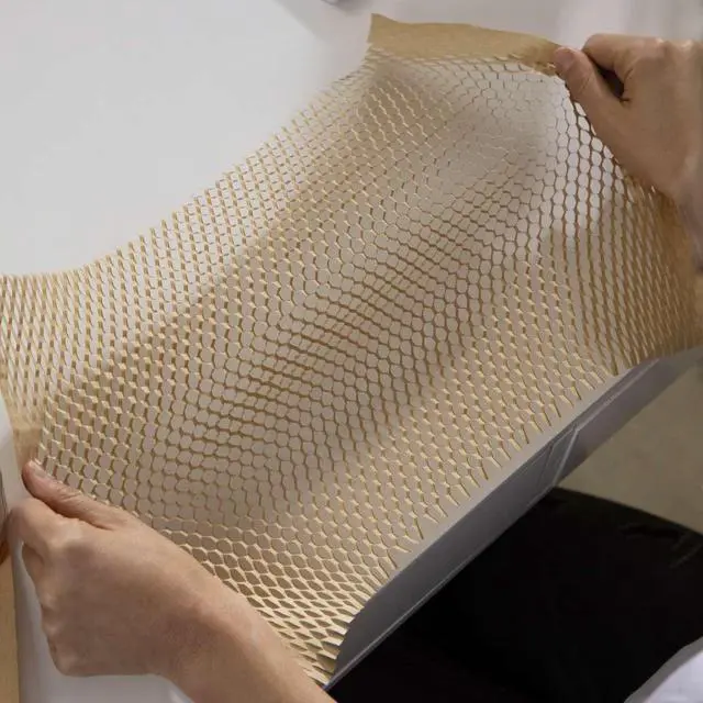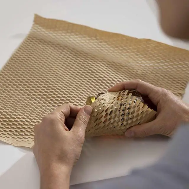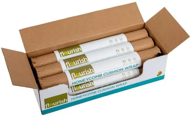 Duck Brand Flourish Honeycomb Cushion Wrap is a more sustainable solution than traditional plastic bubble cushioning; honeycomb wrap is made with 40% recycled content. It's also curbside recyclable in your standard recycling bin. The die-cut honeycomb stretches easily to create loft and cushioning that protects items, and the interlocking paper structure attaches to itself, so no tape is needed! Instead, please fold the paper over to secure it. Plus, it easily tears by hand for a quick solution. Use honeycomb wrap to protect items or fill empty voids when packing boxes so your valuables stay put and safe. Country of Origin: United States.