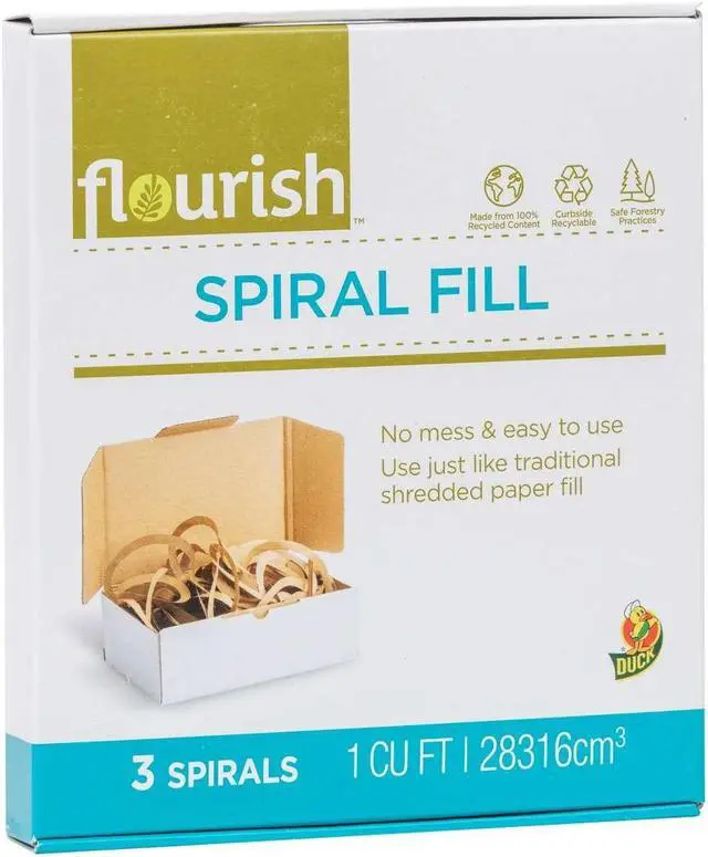 Duck Brand Flourish Spiral Cushion Fill offers a simple and sustainable alternative to packing peanuts and crinkle paper. This box fill is made with 100% recycled content paper and is curbside recyclable in your standard recycling bin. The spiral design offers a unique and appealing look and expands to 10x its original size for added protection during shipping and gift wrapping. Plus, it's easy to use - lift the paper, shake out the spirals and then fill your box. The dustless, large waves make clean up a breeze while the unused portion remains flat for compact storage. Use spiral cushion fill to add extra protection around items in boxes or prevent shifting and damage during shipping. Country of Origin: United States.