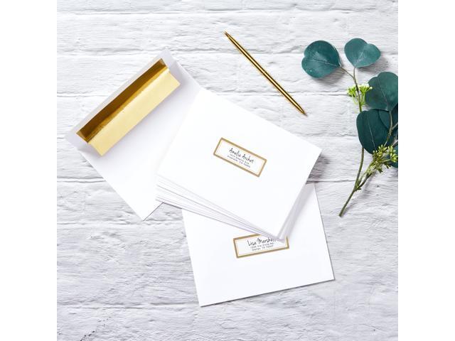 - Add an elegant touch to wedding invitations, holiday cards, Christmas cards, thank you cards, products or stationery with eye-catching matte white labels with metallic gold borders