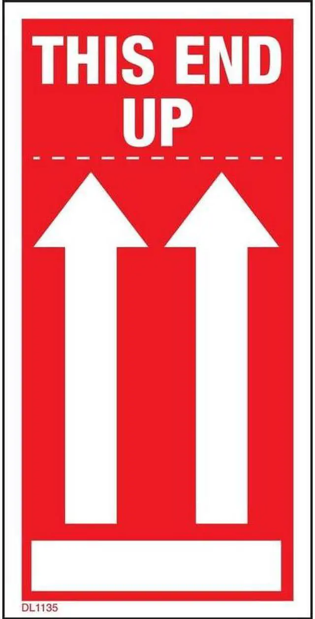 Ensure packages are handled properly with red This End Up labels featuring white arrows. At 500 per roll with bulk pricing at Supplies Shops, you can stock up.