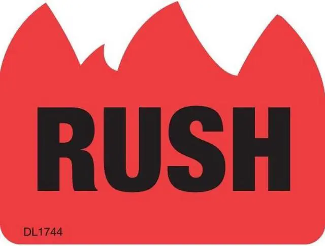Labels Measure: 1-1/2" x 2", 500 Labels per Roll, Label Color: FLR Red/Black, "RUSH", Paper Label Stock On Silicone Coated Release Paper, Made in USA, Labels Ship in 2-3 Days