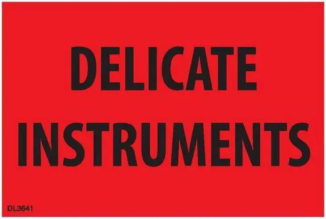 Labels Measure: 2" x 3", 500 Labels per Roll, Label Color: FLR Red/Black, "DELICATE INSTRUMENTS", Paper Label Stock On Silicone Coated Release Paper, Made in USA, Labels Ship in 2-3 Days