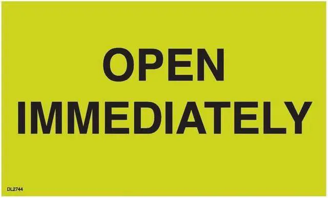 Labels Measure: 3" x 5", 500 Labels per Roll, Label Color: FLR Green/Black, "OPEN IMMEDIATELY", Paper Label Stock On Silicone Coated Release Paper, Made in USA, Labels Ship in 2-3 Days
