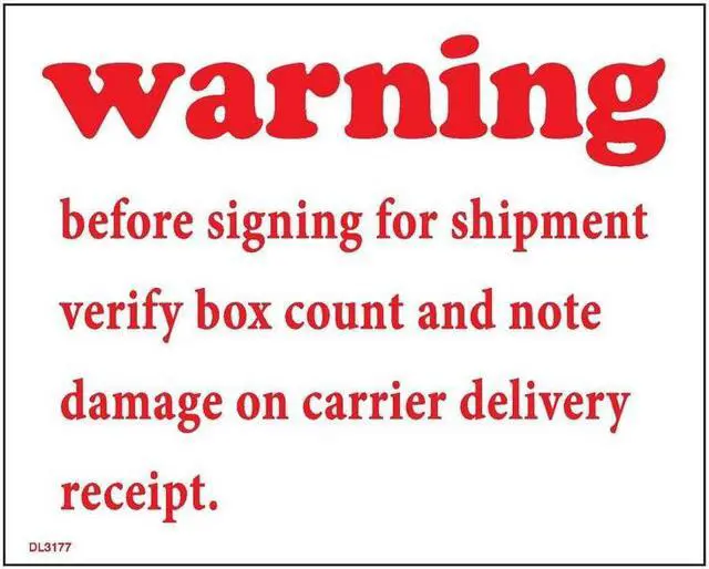 Color: White/Red, "WARNING-BEFORE SIGNING FOR SHIPMENT VERIFY BOX COUNT AND NOT DAMAMGE ON CARRIER DELIVERY RECIEPT ", Paper Label Stock On Silicone Coated Release Paper, Made in USA, Labels Ship in 2-3 Days