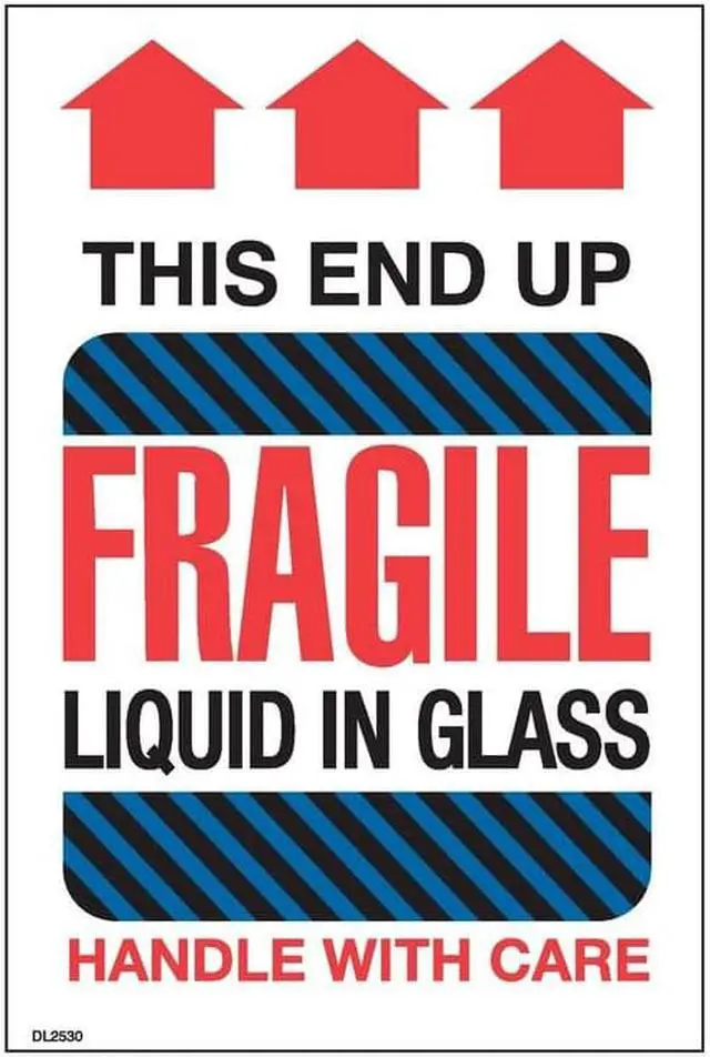 Labels Measure: 4" x 6", 500 Labels per Roll, Label Color: White/Red, "THIS END UP FRAGILE LIQUID IN GLASS HANDLE WITH CARE", Paper Label Stock On Silicone Coated Release Paper, Made in USA, Labels Ship in 2-3 Days