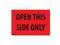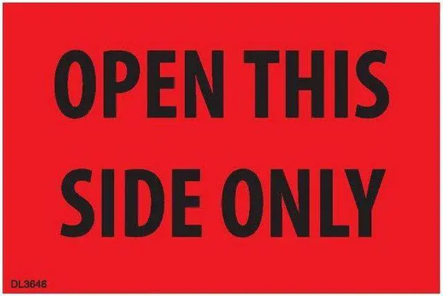 Labels Measure: 2" x 3", 500 Labels per Roll, Label Color: FLR Red/Black, "OPEN THIS SIDE ONLY", Paper Label Stock On Silicone Coated Release Paper, Made in USA, Labels Ship in 2-3 Days