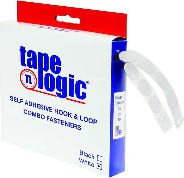 Tape Logic Combo pack with 3/4" white dots is rubber based, pressure sensitive adhesive for both high and low temperature environments. Pack includes both hooks and loops.
