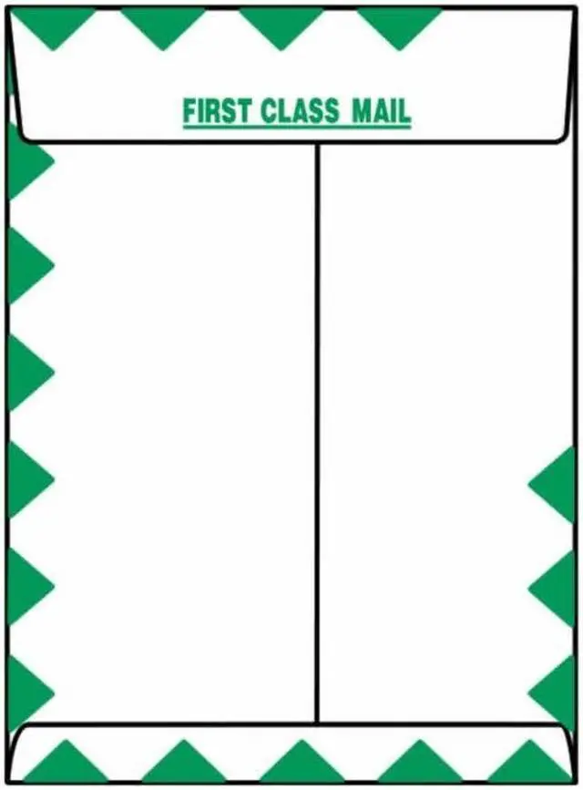 10"x 13", Open End First Class Catalog Envelope, No Window, Dura Print, White Paper/Poly/Paper, Smooth Finish, Center Seam, Flap Down, Kwik-Tak, Printed Green 1st Class Border, 500 Qty / Box, 500 Qty / Ctn, 27 lbs. per Box