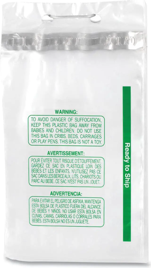 Designed to deliver ultimate packaging results. Ready-to-ship e-commerce bag features metalized, antistatic release liner for reduced static and a steady pull. Adhesive strip on the top provides a reliable and permanent closure. Stainless steel wicket aids in keeping bags neat and allows bags to be hung for quicker loading. Perforated header allows effortless bag hanging and removal from the wicket. Trilingual suffocation warning. Application: E-Commerce; Thickness: 1.5 mil; Material(s): Low-Density Polyethylene (LDPE); Width: 9".