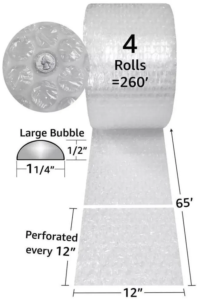 Large Bubble 260' x 12" Wide 1/2" Wrap - our bubble cushion rolls come in small, medium, and large sizes to meet various packaging needs. These versatile bubble wrap sheets are available in different widths and lengths, providing a lightweight solution to reduce shipping costs while offering maximum protection for fragile items and filling voids in boxes.