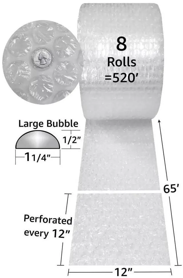 Large bubble 520' x 12" wide 1/2" wrap that is ideal for protecting all type of fragile items. You can use them for packing, storing and moving out. They are perfect for wrapping and securing all type of items regarless of its shape. Make your wrapping process more simple and practical with this large bubble roll.