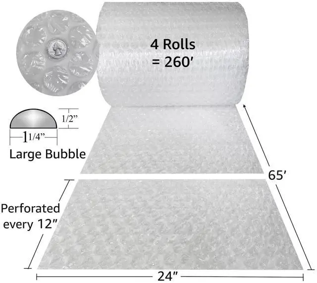 Large Bubble 260' x 24" Wide 1/2" Wrap - Discover High-Quality Bubble Wrap Rolls at UOFFICE, we offer superior quality bubble wrap rolls that provide robust protection for your products. Our high-grade bubble rolls are ideal as void-fill to absorb transportation vibrations, reduce abrasion and friction, and mitigate shock and impact.