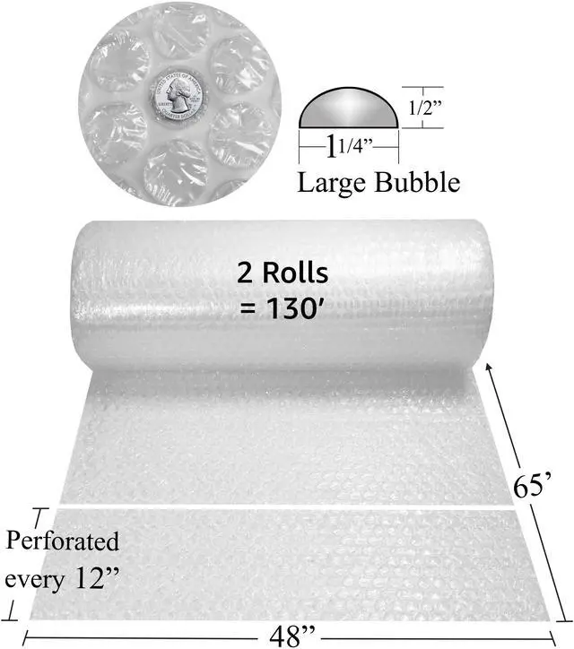 Large bubble 130' x 48" wide 1/2" wrap roll can help facilitate your packaging process. All you need to do is simply wrap and secure your most valuable items with this bubble roll. Its bubble cushioning helps protect items against shocks and vibrations.