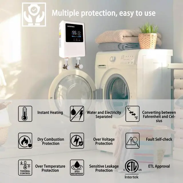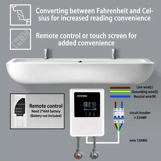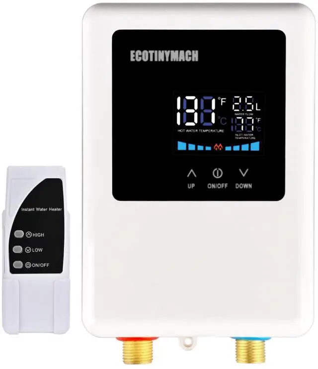 Experience the convenience and efficiency of ECOTINYMACH 110V water heater without water tank. This mini water heater is the perfect solution for American users seeking instant hot water, space saving design, energy-saving, remote control convenience, and easy reading.