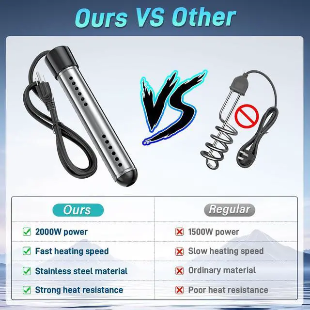 Powerful Rapid HeatingExperience fast 104°F water in minutes with our 2000W immersion water heaterand. electric water heater efficiently warms 5 gallons water in ~30 minutes (winter conditions may require slightly longer). Ideal for quick hot water needs.