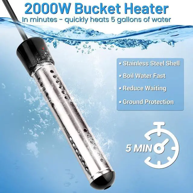 With high power of 2000W output, this immersion water heater can heat 5 gallons water in minutes and about 20 minutes to 104 degrees Fahrenheit.