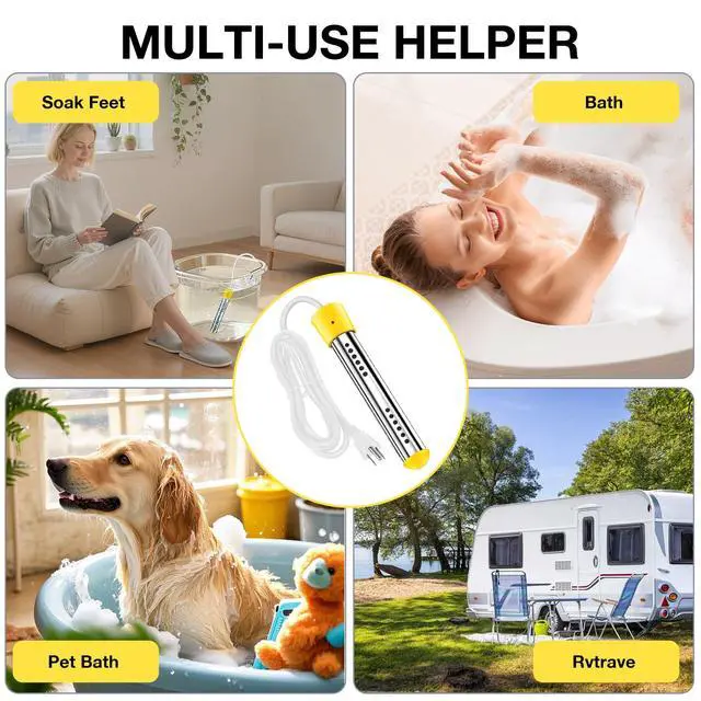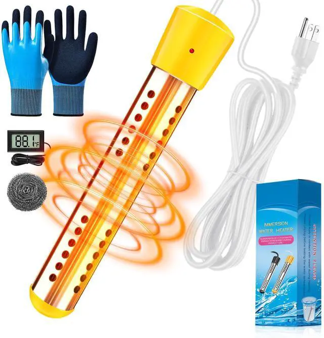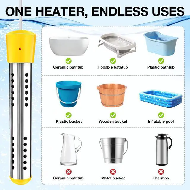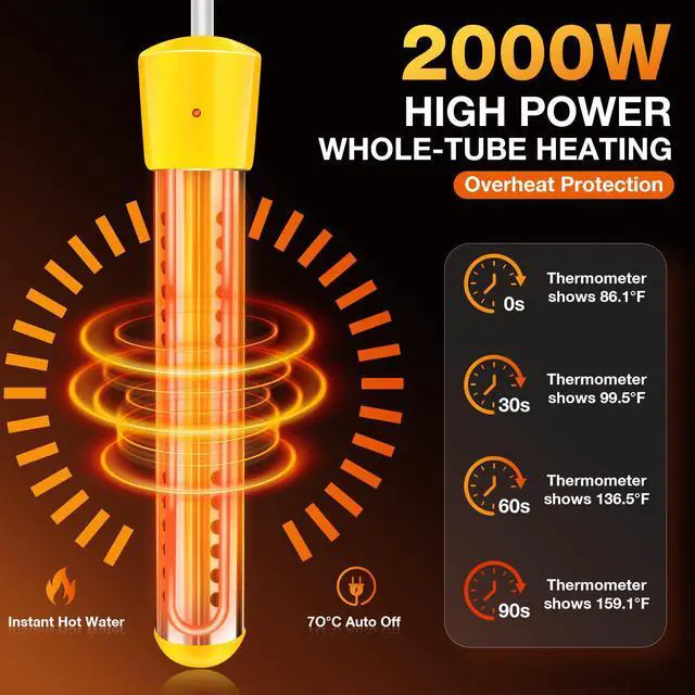 2000W Fast Heating-No more waiting for hot water! Get it in minutes with this yellow immersion water heater that delivers rapid performance, heating a full bucket heater 5 gallon quickly. The ultimate portable water heater, its efficient internal annular whole-tube heating element increases water contact surface-heats more quickly and efficiently, letting you enjoy comfortable hot water anytime and anywhere.