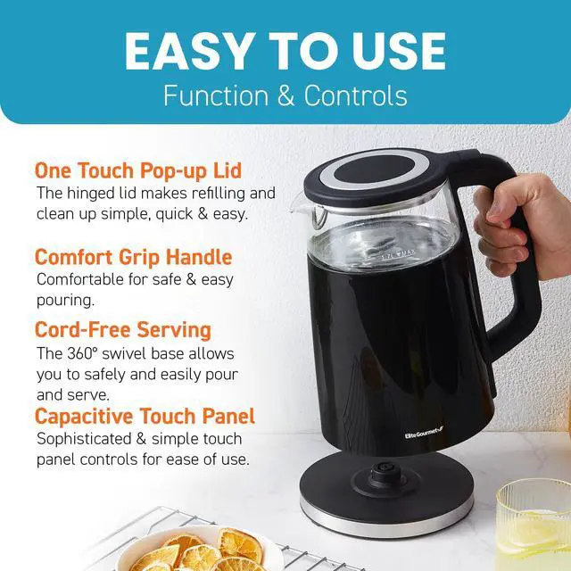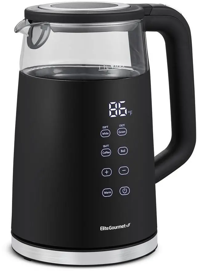 BPA FREE: The Elite Gourmet Touch-Screen Electric 1.7L Water Kettle has a #304 food-grade stainless-steel interior, cordless base and BPA-free parts that heat water at the touch of a button.