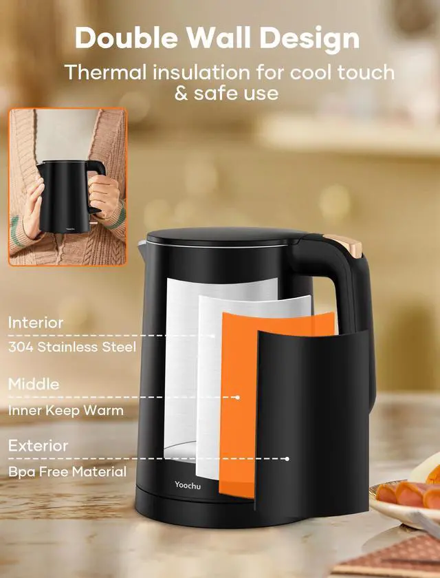 Anti-Scald Cool Touch Kettle - The double-wall kettle insulation keeps water hot longer while the exterior stays cool. Safe for making oatmeal before school or when kids grab a late-night hot chocolate. No burned hands, safer for the elderly and children.