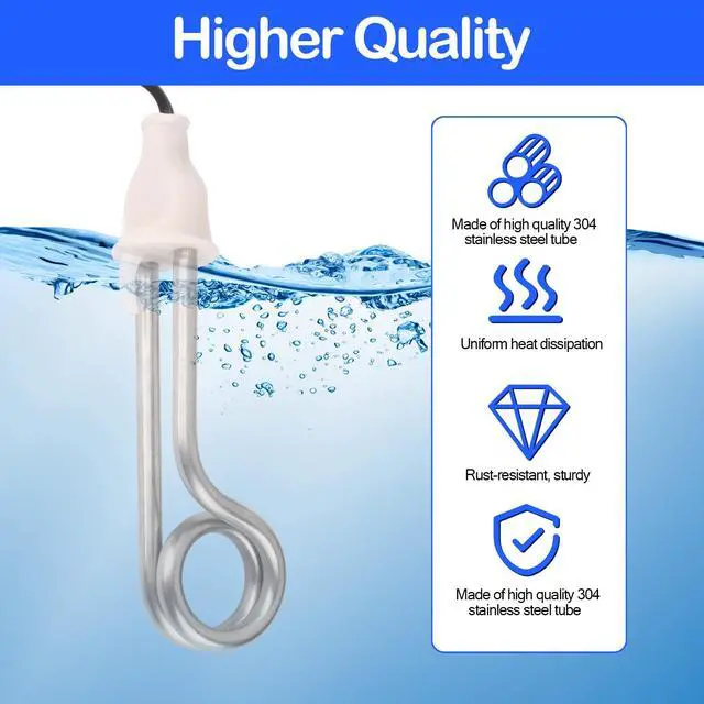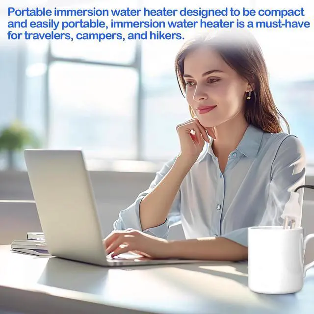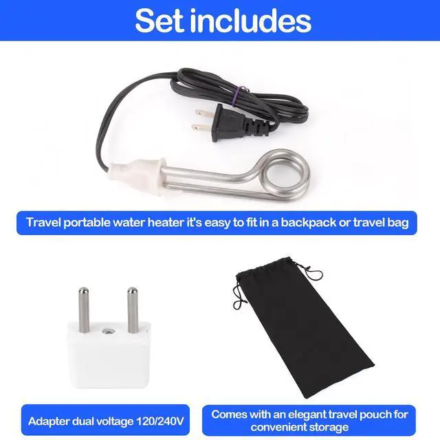 - Immersion water heater is easily portable and fits snugly in your backpack or travel bag