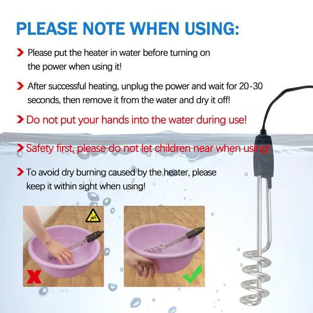 • Stainless Steel Immersion Water Heater X 1Work with the heater fully immersed in water.