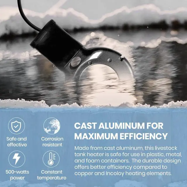CAST ALUMINUM FOR MAXIMUM EFFICIENCY: Made from cast aluminum, this livestock tank heater is safe for use in plastic, metal, and foam containers. The durable design offers better efficiency compared to copper and Incoloy heating elements.