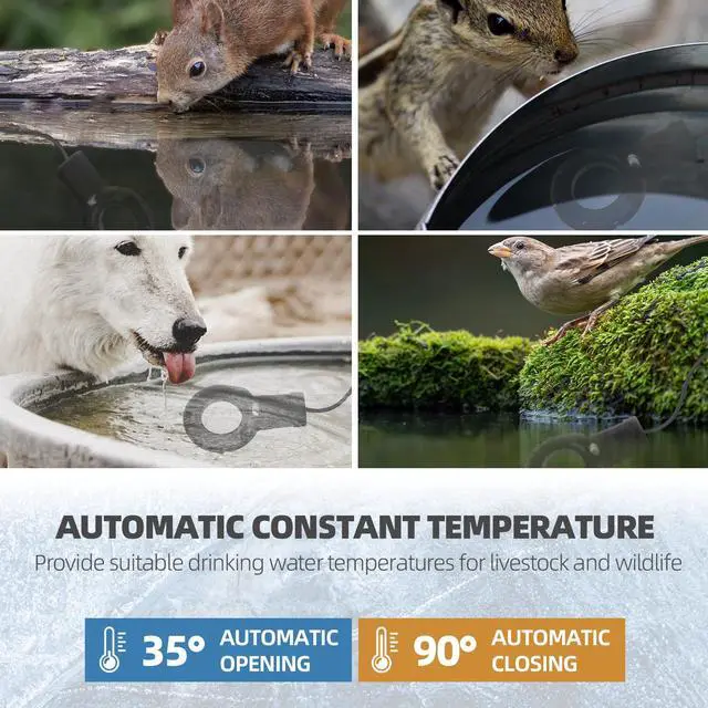 THERMOSTATICALLY CONTROLLED LIVESTOCK TANK HEATER: Save energy with the built-in thermostat, which activates the de-icer when the water approaches freezing and automatically shuts off when the water reaches 90°F. Perfect for various outdoor water applications including birdbaths and small animal waterers.