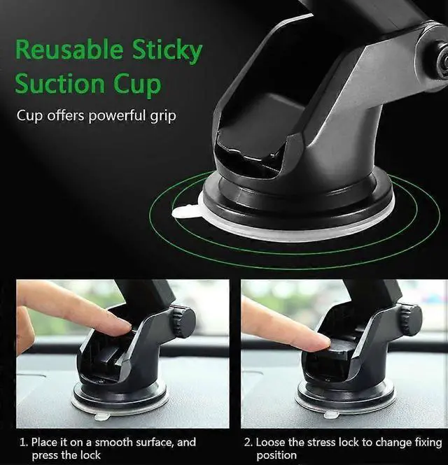 **Strong Suction Cup & Gel Adhesive**: Enhanced suction cup with adhesive gel sticks firmly to your dashboard or windshield, washable and reusable for long-lasting hold.