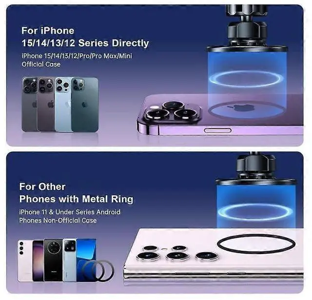 **Wide Compatibility**: Works with all smartphones, including iPhone 15/14/13/12 series (direct use), and other models via Mag-Safe cases or metal rings (not included).