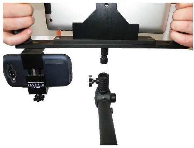 The UWS (Ultimate Work Station) utilizes two 12" articulating arms mounted to three geared posi-lock pushbutton clamps that allow for positioning the UWS at virtually any angle. The main platform allows attachment of our tablet mount (PHO-TB-3005) while our smart phone bracket (PHO-SF-1001) can be place to the lower portion. Mounting holes allow the smart phone mount to be placed