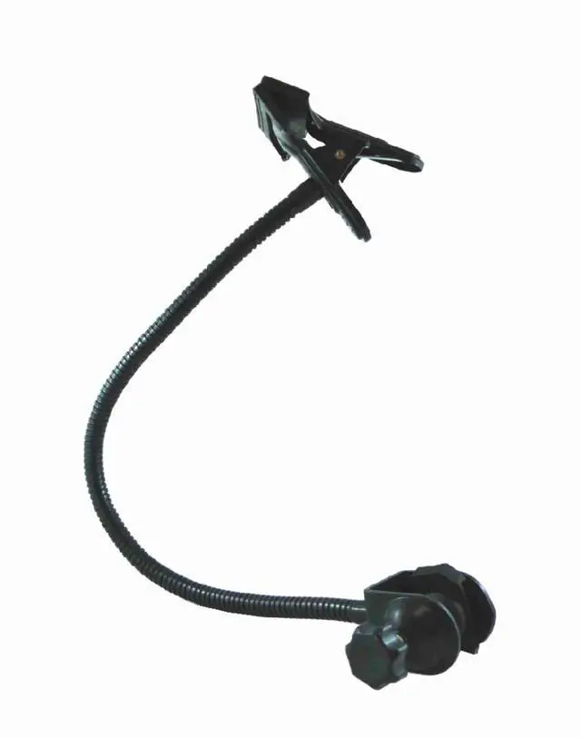 Between the clamp and clip is a 18 inch long,1/2 inch wide bendable gooseneck. All is a black finish. Great when an extra set of hands is needed.
