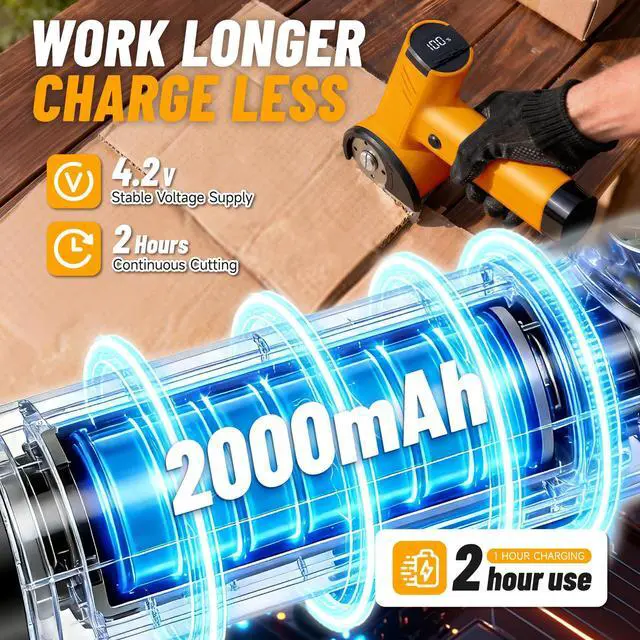 • Cordless Freedom, Cut LongerThis electric box cutter features a long-lasting 2000mAh rechargeable lithium-ion battery, providing over 120+ mins of continuous wireless runtime. The modern USB-C port with included cable allows for a full charge in just 1 hours, keeping your work going.