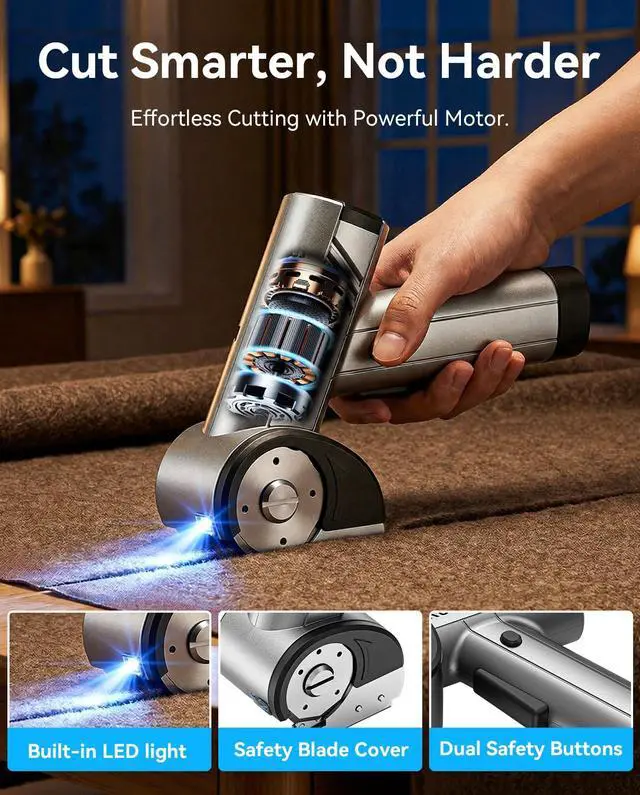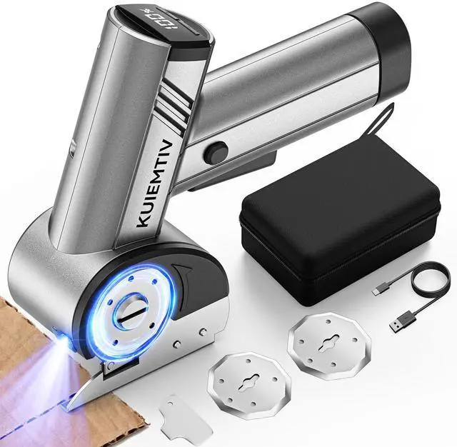 Effort-Saving, Safe & Easy to OperateFeaturing an ergonomic, effort-saving design with one-touch activationno heavy pushing requiredmaking it ideal for seniors or those with limited hand strength. Includes extra 2 premium SK5 self-sharpening blades and a quick-change key for hassle-free replacement. With full safety protection, low-noise operation, and a built-in LED work light, this electric scissors for cardboard is safe and simple for everyone, even in low-light conditions. It also makes a thoughtful gift for your parents, loved ones, or friends.